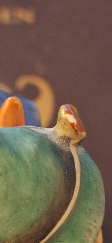 De laatste foto is gemaakt met vergrootglas en laat zien dat het veertje op de hoed wat kaal is. Het is niet scherp. Er is met name iets verf af. De prijs is hierop aangepast.